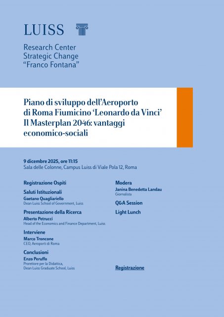 Martedì 9 dicembre 2025, alle ore 11:15, la Sala delle Colonne del Campus Luiss di Viale Pola 12 a Roma ospiterà la presentazione ufficiale dello studio del Centro di Ricerca in Strategic Change “Franco Fontana” dedicato all’analisi degli impatti economici e sociali del Piano di Sviluppo Sostenibile dell’aeroporto di Roma Fiumicino “Leonardo da Vinci”.