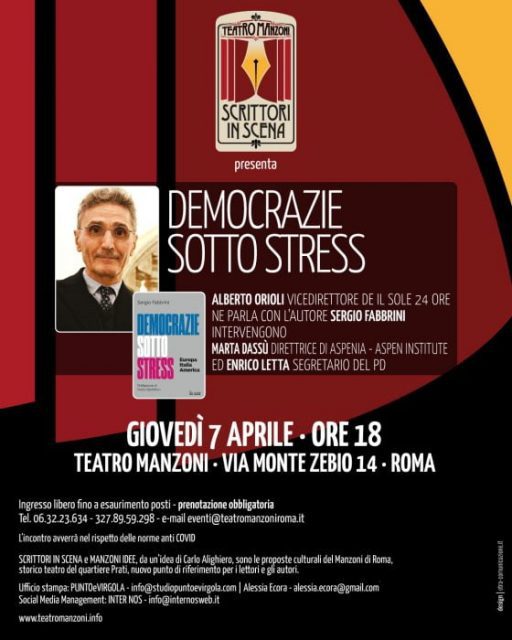Alberto Orioli, vicedirettore de Il Sole 24 ore presenta “Democrazie sotto stress” di Sergio Fabbrini nel nuovo incontro di “Scrittori in scena” al Teatro Manzoni di Roma, giovedì 7 aprile alle ore18.00. Intervengono con l’autore Marta Dassù, Direttrice di Aspenia – Aspen Institute ed Enrico Letta, Segretario del Pd.