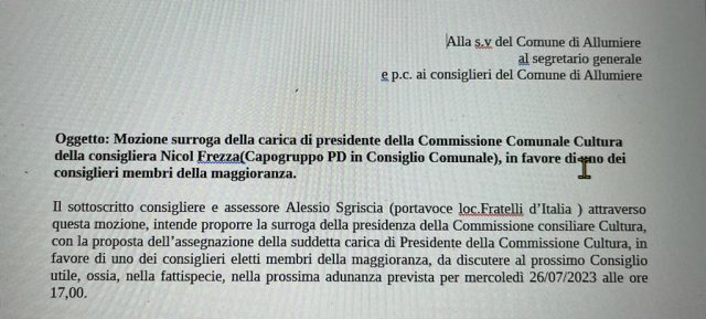 Presentata dal consigliere e assessore e portavoce FdI Alessio Sgriscia una mozione per surrogare la delega di Presidente della Commissione Consiliare Cultura a Nicol Frezza, consigliera Capogruppo del PD, a favore di uno dei membri di maggioranza del Fronte Civico.