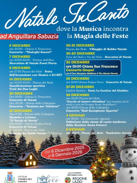 Ad Anguillara Sabazia, il Natale si accende di musica, calore e comunità con l’edizione 2025 di “Natale InCanto”, il calendario di eventi natalizi organizzato dal Comune in collaborazione con la Pro Loco e le associazioni del territorio.