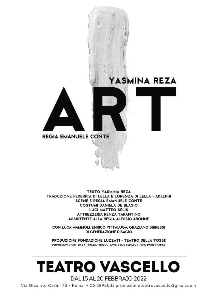 Una commedia crudele e divertente sull’amicizia, scritta da Yasmina Reza ,Premio Moliére nel 1994 e tradotta in circa trenta lingue. In una stanza, tre amici si confrontano sulla qualità artistica di un quadro completamente bianco discutendo sul prezzo d’acquisto per il quale è stato comprato da uno di loro.
