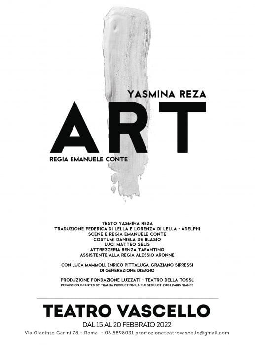 Può addirittura sembrare spietata, ma il suo è amore per la verità. Dialoghi serrati, a tratti straordinariamente comici, eppure, poco a poco, mentre ridiamo scopriamo che capirsi è veramente difficile; quanti silenzi, quante bugie sono necessari per evitare la fine di un’antica amicizia o di un amore. La sincerità è davvero la via più efficace per dare continuità a un rapporto? E l’arte? Che c’entra l’arte contemporanea in tutto ciò? Esiste qualcosa di più soggettivo? Un quadro bianco, tutto bianco, con delle scriminature quasi invisibili diventa il campo di battaglia dei sentimenti di questi tre grandi amici.