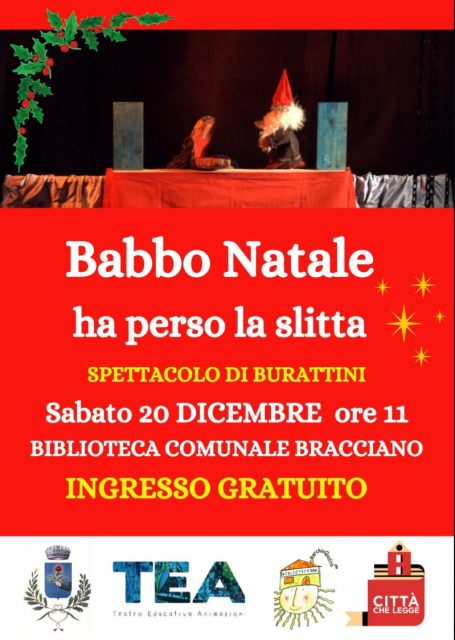 Sabato 20 dicembre alle ore 11, la Biblioteca Comunale di Bracciano ospiterà lo spettacolo di burattini “Babbo Natale ha perso la slitta”, a cura dell’associazione culturale TEA – Teatro Educativa Animazione.
