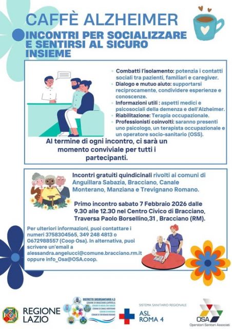 Il Caffè Alzheimer Bracciano parte sabato 7 febbraio 2026. È un progetto gratuito dedicato alle persone affette da Alzheimer e ai familiari caregiver. Conta perché offre uno spazio sicuro di incontro, riducendo l’isolamento che spesso accompagna la malattia.