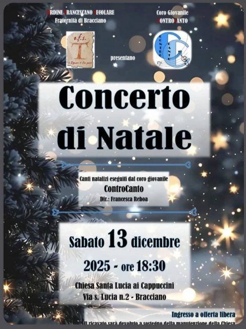 Sabato 13 dicembre 2025, alle ore 18:30, nella Chiesa Santa Lucia ai Cappuccini, in via Santa Lucia n. 2, si terrà il Concerto di Natale organizzato dalla Fraternità di Bracciano dell’Ordine Francescano Secolare, in collaborazione con il Coro Giovanile ControCanto diretto da Francesca Reboa.