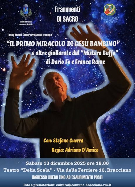 Sabato 13 dicembre 2025, alle ore 18.00, salirà sul palco Stefano Guerra con lo spettacolo “Il primo miracolo di Gesù Bambino e altre giullarate dal Mistero Buffo” di Dario Fo e Franca Rame, per la regia di Adriano D’Amico.