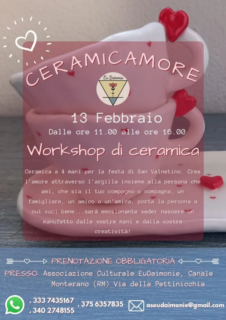 Sei in vena di romanticismo? Vieni a sperimentare la tua creatività con la persona che ami e a cui vuoi bene, che sia il tuo compagno/a, un famigliare, un amico/a, una persona speciale! Un workshop di ceramica da realizzare a 4 mani. Realizzeremo un manufatto in tema “romantico”, sarà emozionante vedere l’argilla prendere forma dalle tue mani!