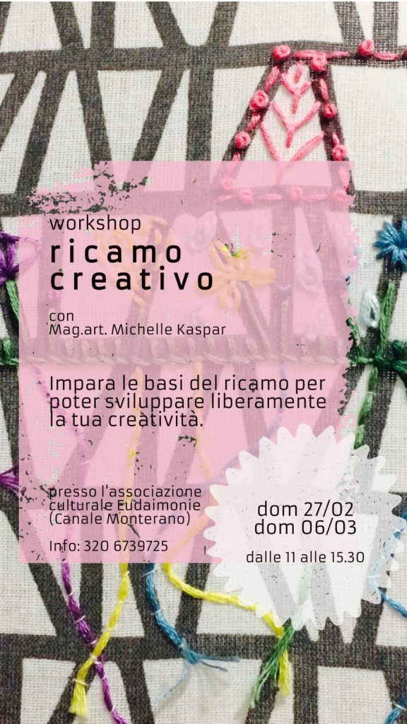 se vuoi imparare i punti base del ricamo per poi spaziare con la tua creatività, abbiamo pensato a due incontri dedicati a questa delicata arte: DOMENICA 27 febbraio e DOMENICA 6 marzo, dalle 11.00 alle 15.30 presso la sede dell’Associazione Culturale EuDaimonie, in Via della Pettinicchia s.n.c. (sopra il vecchio lavatoio).