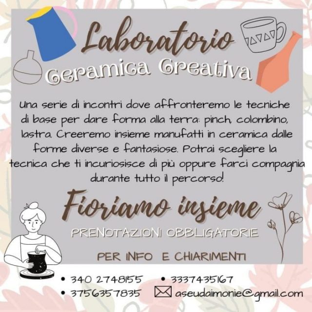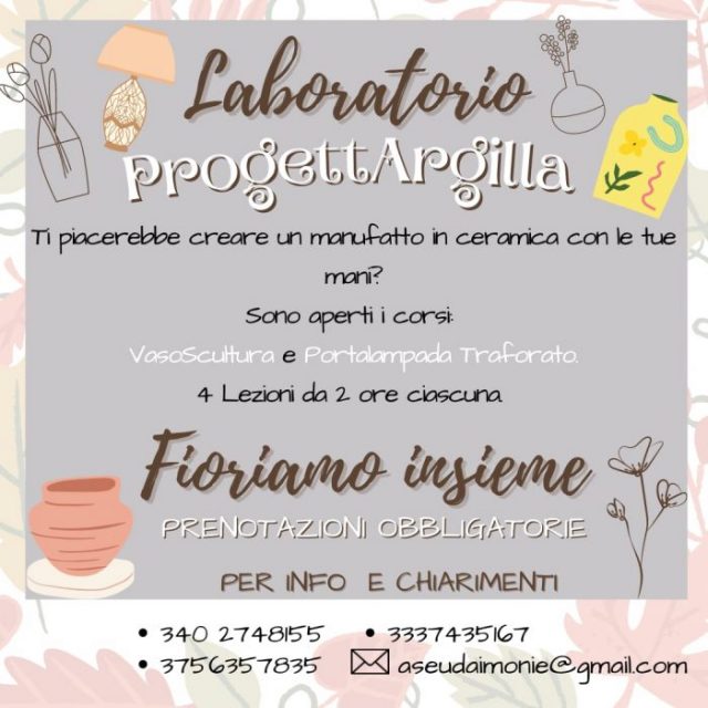 ti piacerebbe realizzare un oggetto in ceramica? Tutti i GIOVEDI’, dalle 15.00 alle 17.00, c’è il corso “Progettargilla”, diviso in moduli da 4 lezioni, in cui, alla fine di ogni modulo, ti porterai a casa un manufatto, che si deciderà di volta in volta insieme. Ad esempio abbiamo realizzato dei portalumini ed ora stiamo realizzando delle teiere.Presso la sede dell’Associazione Culturale EuDaimonie, in Via della Pettinicchia s.n.c. (sopra il vecchio lavatoio). Per info: Giorgia Zaccaria 375-6357835