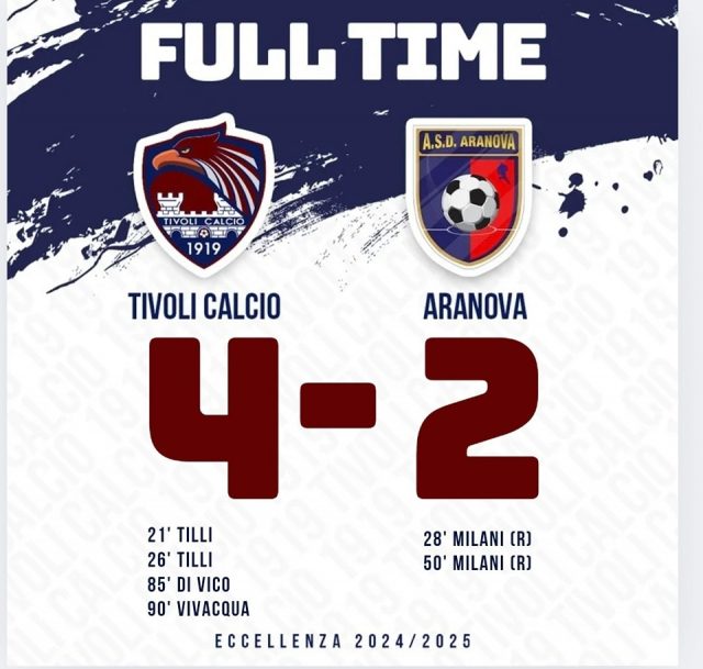 Festa del goal tra Tivoli e Aranova. I padroni di casa si portano sul 2-0 verso la mezz’ora di gioco grazie alla doppietta di Tilli con gli ospiti che accorciano le distanze poco dopo con il rigore di Milani. Nella ripresa gli ospiti arrivano al 2-2 grazie a un altro rigore di Milani, ma sul finire della partita all’85esimo il Tivoli si riporta in vantaggio con Di Vico e chiude la partita al 90esimo con Vivacqua.