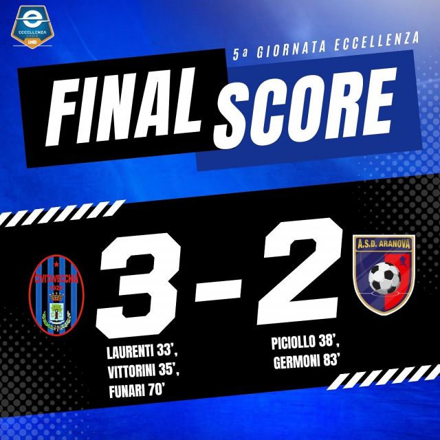 Nella ripresa l’Aranova si rende pericoloso ma il Civitavecchia è bravo a resistere. Poi arriva il 3-1 di Funari su schema da calcio di punizione.