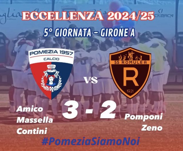 Festa del goal tra Pomezia e Romulea. Il primo tempo si conclude 2-0 con le reti di Amico e Massella. All’inizio del secondo tempo i padroni di casa si portano sul 3-0 con il goal di Contini. Verso la fine della partita gli ospiti trovano due goal con Pomponi e Zeno.