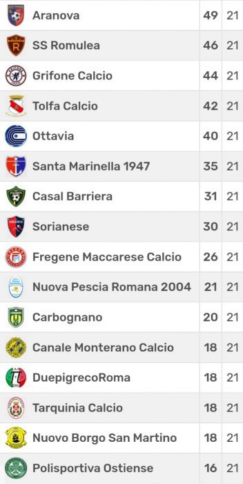 Dopo più turni di dualismo in cima alla classifica, alla ventunesima giornata si ferma una delle due leader del girone: nel big match di giornata, il derby romano tra Romulea e Grifone, l’apporto dei tifosi locali non basta ai giallorossi per evitare la sconfitta ai danni di un Grifone cinico e abile in fase difensiva, salito al terzo posto. Dal canto suo l’Aranova non sbaglia nel match casalingo contro il Duepigrecoroma e con un netto 3-0 mantiene la prima piazza.