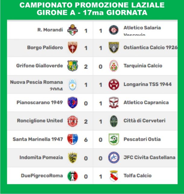 Goleada del Asd Santa Marinella 1947, che travolge per 6-0 la Pescatori Ostia, in una gara che ha avuto davvero poca storia. Il primo tempo si chiude sul 2 a 0 grazie alle reti di Cerroni su colpo di testa al 13° e di Trincia con un gol da cineteca da posizione impossibile al 37°. Nel secondo è un monologo rossoblu e a complicare le cose agli ospiti e’ l’espulsione di un calciatore. Nella ripresa vanno a segno Tabarini (doppietta), Trincia e il subentrato Brutti. Il Santa Marinella, dopo questo turno si trova con quattro punti di vantaggio sulle dirette inseguitrici Grifone Gialloverde e Ostiantica.