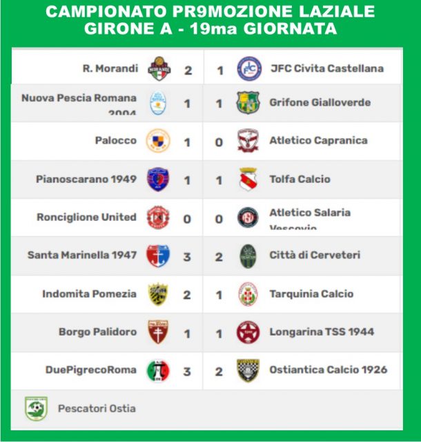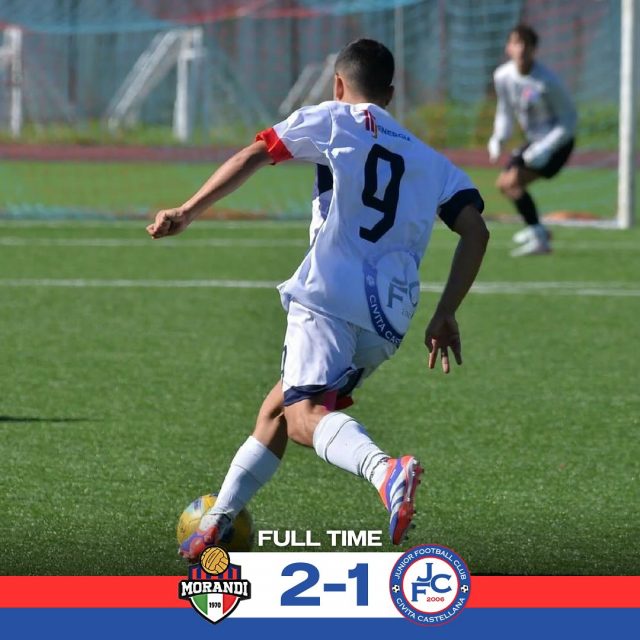 Anticipo dell’ultima giornata di andata, la Morandi di mister Di Marco ospita all’Anco Marzio la JFC di mister Santini. Primo tempo in cui gli ospiti ci provano in contropiede con Salvatori e Massaini ma sono sterili davanti alla porta, e a seguito di una disattenzione i padroni di casa al 21’ passano in vantaggio con Ferrazzoli. Ottima la reazione di Salvatori e compagni che dopo pochi minuti pareggiano con una gran punizione dello stesso numero 10 rossoblù. Termina, così, 1 a 1 il primo tempo. Negli spogliatoi mister Santini incoraggia la squadra, ma nella seconda frazione di gara è il Morandi a passare in vantaggio al 28’st con una prodezza ancora di Ferrazzoli. I civitonici spingono fino alla fine per cercare di agguantare il pareggio ma finisce 2 a 1 per i padroni di casa. Da segnalare l’espulsione di Palmarini per fallo da ultimo uomo al 38’st e al 46’st anche il portiere locale Vicchi per doppia ammonizione. Rodolfo Morandi, quindi, che sale a 25 punti in classifica; JFC Civita Castellana, invece, che rimane a 9.