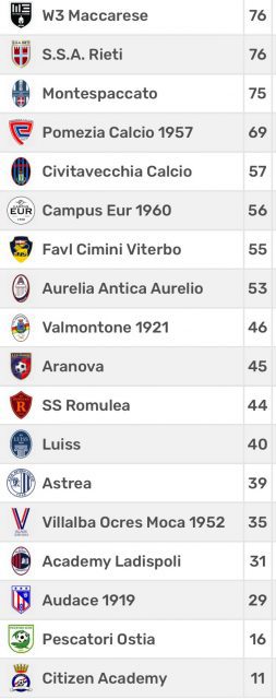 Luiss 0 – W3 Maccarese 4: Stravincono i bianconeri in maniera netta sul campo dei padroni di casa, doppietta di Damiani che con i suoi 43 gol diventa il calciatore von più reti in campionato in Italia nella stagione 23-24, insieme a lui le reti di Ferraro e Ferrari; con la vittoria del Rieti sul campo dell’Aurelianticaurelio per 3 reti a 0 entrambe le squadre hanno raggiunto 76 punti e per questo, si disputerà uno spareggio al “Tre Fontane” fra chi andrà direttamente in D e chi invece dovrà disputare i playoff.