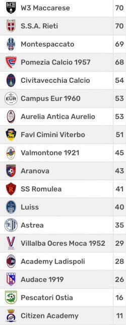 FC Viterbo 3 – W3 Maccarese 3: Big match pieno di gol al Comunale di Vignanello, con i padroni di casa che vanno in vantaggio anche per 3 reti a 0 ma i bianconeri non si danno per vinti e riescano addirittura a pareggiare la partita grazie ad un autogol, al solito Damiani e a Di Giovanni che nei minuti finali realizza la rete dell’incredibile pari che permette alla W3 di rimanere prima in classifica ma adesso, assieme al Rieti a 70 punti.