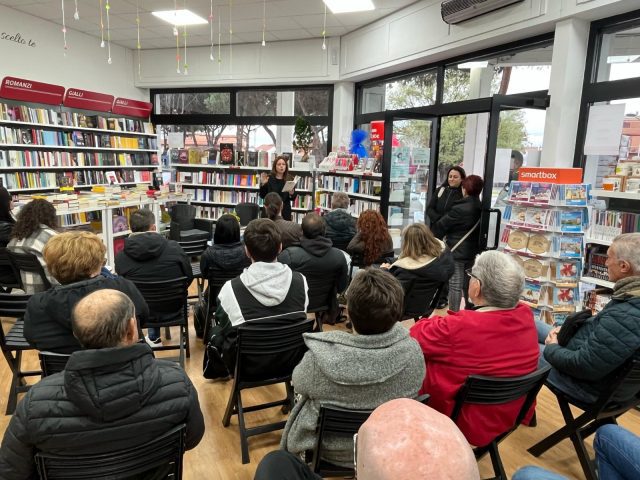 Così, dopo aver spostato i vari scaffali interni alla libreria, la presentazione si è svolta al chiuso, offrendo un’immagine davvero suggestiva. In una singola foto un pubblico davvero numeroso completamente circondato da libri, attento, felice di “perdersi” tra le pagine di un caro e “vecchio” libro.