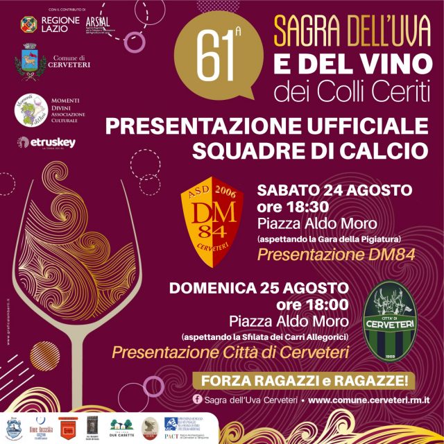 Poco prima degli appuntamenti più attesi della Sagra, la “Gara della Pigiatura” di sabato 24 agosto e la sfilata dei “Carri Allegorici” di domenica 25 agosto, sul palco di Piazza Aldo Moro saliranno i calciatori della Dm84 e del Città di Cerveteri.
