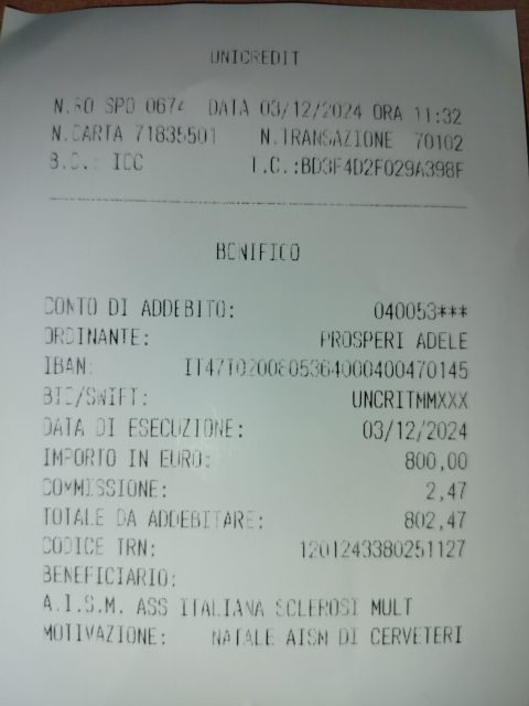 800 euro che andranno ad incrementare le attività dell’Associazione Italiana Sclerosi Multipla.
