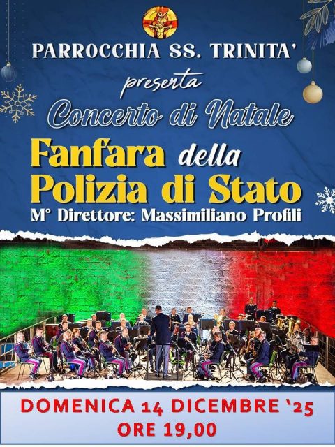 Domenica 14 dicembre alle ore 19:00, l’appuntamento sarà invece nella suggestiva cornice della Chiesa della Santissima Trinità, per il Concerto di Natale della Fanfara della Polizia di Stato, diretta dal Maestro Massimiliano Profili.