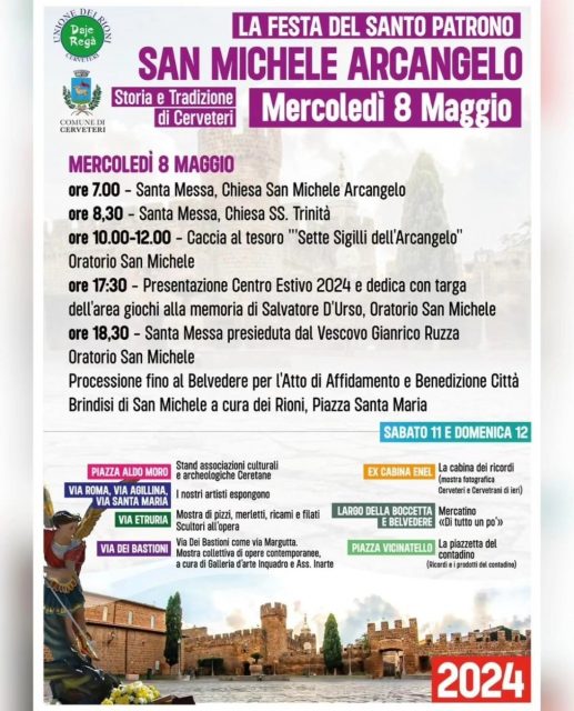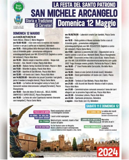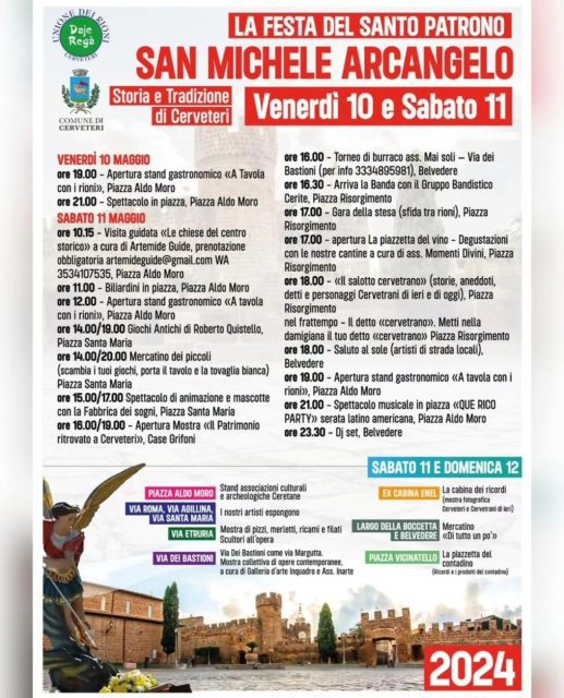 “Tradizione e storia si intrecciano in un programma ricco di eventi, dai festeggiamenti religiosi ai giochi popolari, dall’enogastronomia agli spettacoli dal vivo per grandi e piccoli. Musica, arte, mostre e artigianato animeranno le vie del centro storico, creando un’atmosfera festosa e coinvolgente. Cerveteri è pronta a festeggiare San Michele Arcangelo, il suo Santo Patrono, e lo fa con una grande festa.