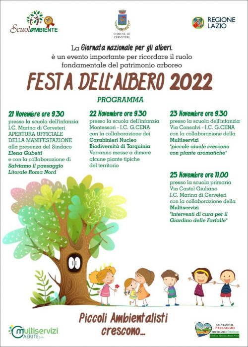 La giornata clou sarà Giovedi’ 24 Novembre ore 9.30 a Largo Almunecar a Cerveteri presso la Grande Quercia, a un anno dalla sua istituzione come “Albero Monumentale”, dove i bambini e i ragazzi di alcune scuole le dedicheranno, come da tradizione, canti, poesie e racconti.