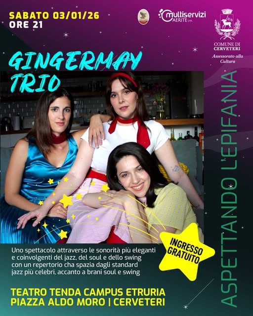 Sabato 3 gennaio 2026 alle ore 21 il Gingermay Trio si esibirà in concerto al Teatro Tenda Campus Etruria, in Piazza Aldo Moro.
