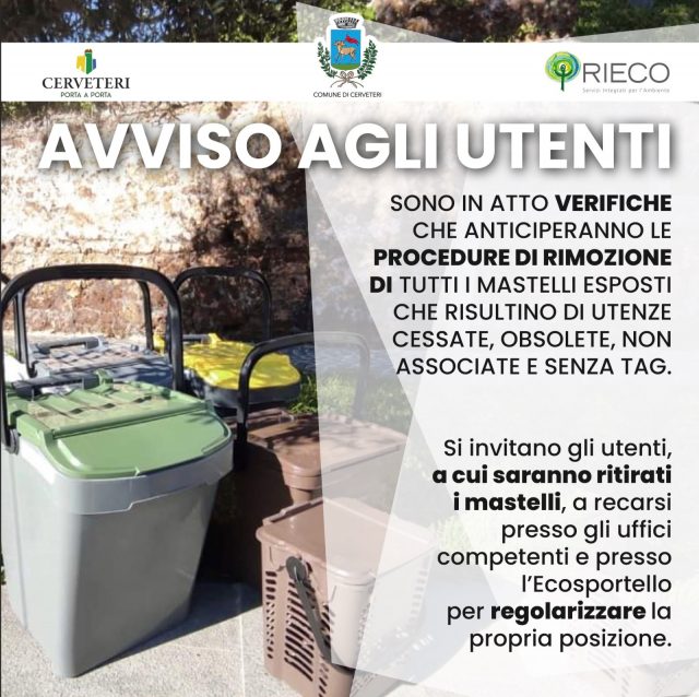 Proprio per questo motivo, la Rieco Spa, in accordo con l’Ufficio Ambiente del Comune di Cerveteri sta effettuando delle verifiche sul territorio, propedeutiche poi alle procedure di rimozione di tutti i mastelli che risultino di utenze cessate, obsolete, non associate e senza tag”.