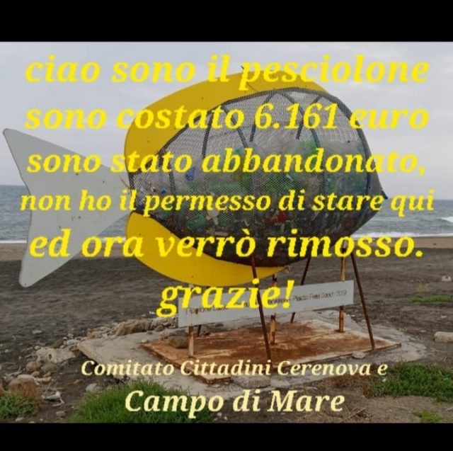 Oggi 13 giugno siamo ancora in attesa di sapere le sorti del nostro amico pesciolone, da fonti sicure siamo certi che il manufatto è fermo con le 4 frecce abbandonato al suo destino.