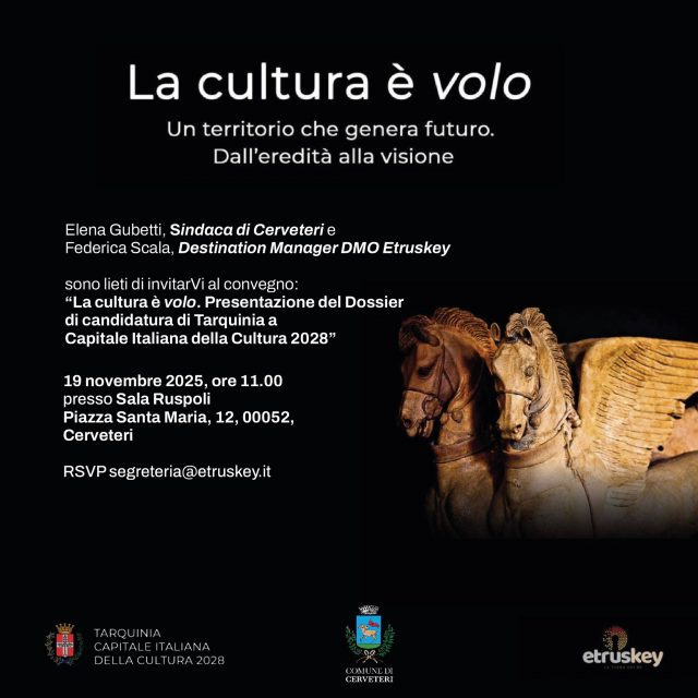La cultura è volo, il dossier di Tarquinia per Capitale Italiana della Cultura 2028 arriva a Cerveteri. Appuntamento mercoledì 19 novembre alla Sala Ruspoli.