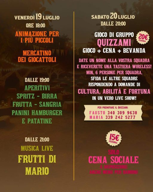 - Dalle 19:00: L’area ristoro offrirà spritz, aperitivi, panini, hamburger, patatine e sangria.