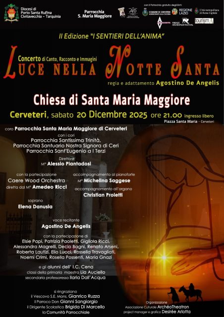 L’iniziativa, giunta alla seconda edizione del ciclo “I Sentieri dell’Anima”, è organizzata dalla Parrocchia Santa Maria Maggiore in collaborazione con la Diocesi di Porto Santa Rufina, il Comune di Cerveteri, la Regione Lazio e varie realtà associative, tra cui l’Associazione Culturale ArcheoTheatron.
