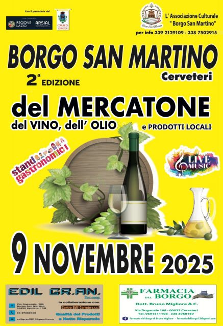 Cerveteri. Domenica 9 novembre 2025, nel cuore della frazione di Borgo San Martino, si svolgerà la seconda edizione del “Mercatone del Vino, dell’Olio e dei Prodotti Locali”: un’occasione all’insegna dell’autenticità, tra calici colmi, note di olio nuovo e sapori genuini del territorio.