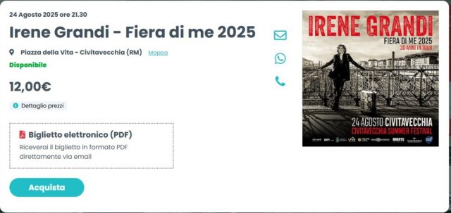 Dopo aver conquistato i teatri d’Italia con il suo tour indoor, Irene Grandi torna a emozionare il pubblico sotto le stelle con il “Fiera di Me Summer Tour”, che questa sera farà tappa alla splendida Marina di Civitavecchia.
