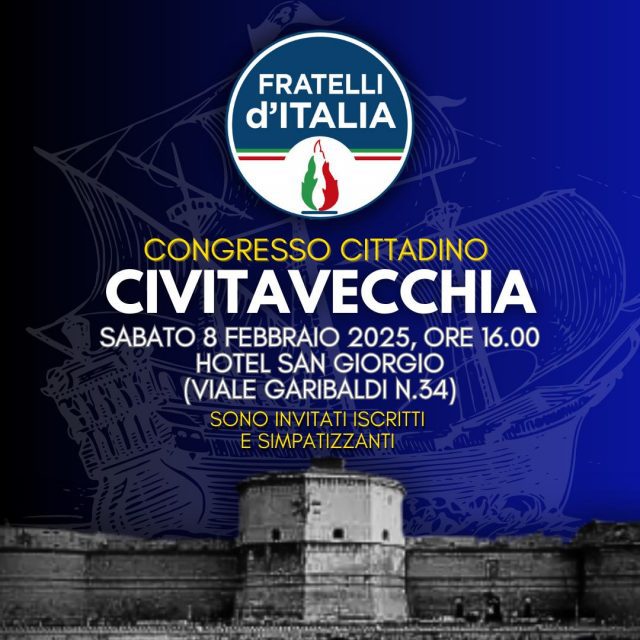Si terrà sabato 8 febbraio pv il congresso cittadino di Fratelli d’Italia Civitavecchia. Appuntamento all’Hotel San Giorgio in viale Garibaldi n. 34 a Civitavecchia, a partire dalle ore 16,00.