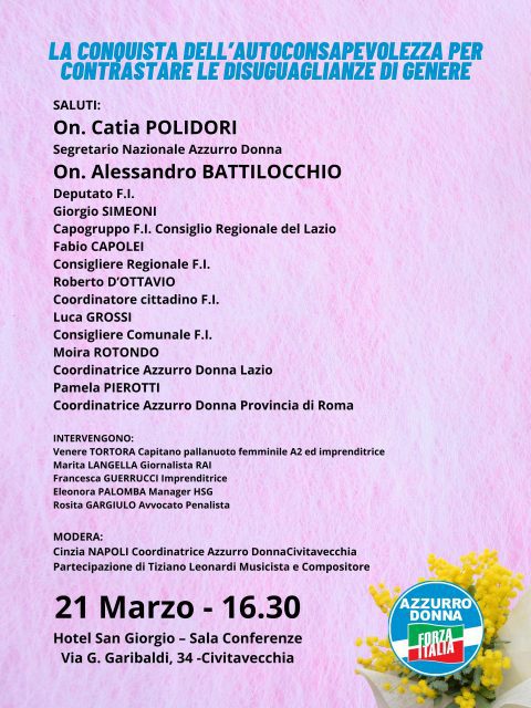 Ieri, l’Hotel San Giorgio di Civitavecchia ha ospitato un importante convegno organizzato da Azzurro Donna dal titolo “La Conquista dell’Autoconsapevolezza per Contrastare le Disuguaglianze di Genere”.