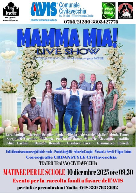 Una mattinata all’insegna dell’energia, della musica e della solidarietà ha animato il Teatro Traiano di Civitavecchia lo scorso 10 dicembre, in occasione del “Mamma Mia! Live Show”, evento organizzato da AVIS Comunale Civitavecchia con finalità benefiche.