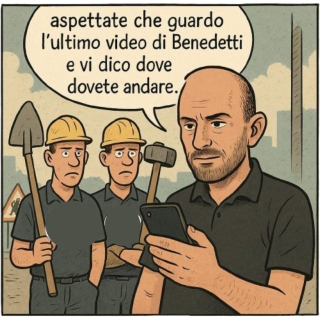 Emblematica, in questo senso, è una simpatica vignetta che circola in questi giorni sui gruppi social: si vede un gruppo di dirigenti della partecipata comunale che si occupa del verde e dell’arredo urbano, con il telefono in mano, mentre dicono “Aspettiamo il video di Benedetti per sapere dove intervenire oggi”.