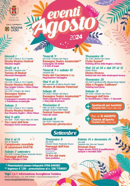 Tarquinia (VT), 29 luglio 2024 – Concerti, spettacoli teatrali, rassegne enogastronomiche, mostre e iniziative culturali. È quanto propone il calendario delle manifestazioni estive per agosto realizzato dal Comune di Tarquinia, con il contributo della Regione Lazio, e la preziosa collaborazione del mondo dell’associazionismo locale.