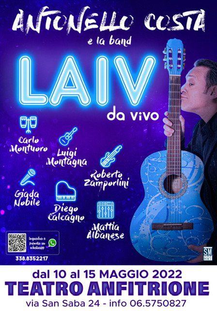 Ma non finisce qui. Dal 10 al 15 Maggio 2022, dopo le tre settimane in cui andrà in scena lo spettacolo “Costa Soul (l’artista e la sua anima)”, Antonello salirà nuovamente sul palco del Teatro Anfitrione con “Laiv da vivo”, dove si esibirà per la prima volta in un vero e proprio concerto acustico, cantando le canzoni del suo ultimo disco “Ridi con me”, magistralmente accompagnato dai musicisti Carlo Montuoro, Luigi Montagna, Roberto Zamporlini, Diego Calcagno e Mattia Albanese e i brani più belli del suo repertorio.