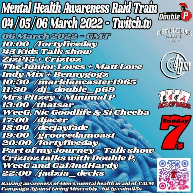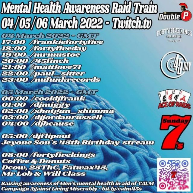 Dal 4 marzo al 6 marzo 2022 decine di deejay specializzati nell’uso di dischi a 45 giri si alterneranno sui loro canali Twitch con dj set esclusivi destinati a raccogliere fondi per l’associazione CALM impegnata nel mondo anglosassone per la salute mentale e il disagio giovanile.