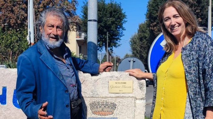 “Oggi abbiamo apposto una targa sulla scritta in pietra calcarea che si trova nella rotonda all’ingresso di Aranova per onorare, alla sua presenza, lo scultore Gaetano Macera che l’ha realizzata nel 2011”.