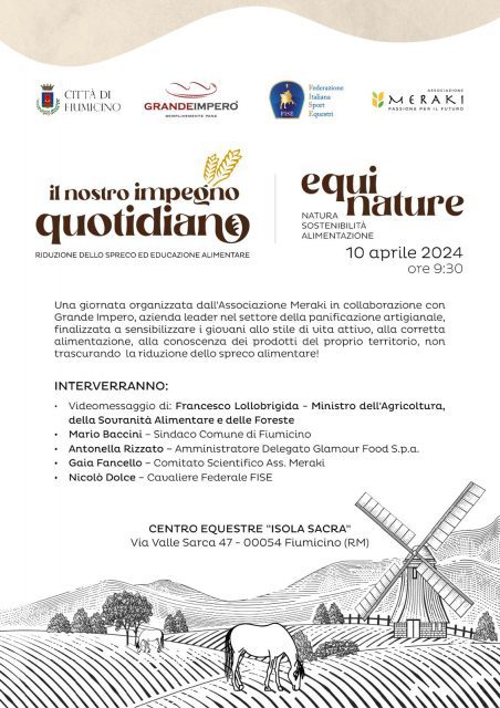 Interverranno all’evento patrocinato dal Comune di Fiumicino ed organizzato dall’Associazione Meraki in collaborazione con Grande Impero: l’Assessore ai servizi sociali, Monica Picca, il Presidente del Consiglio Comunale, Roberto Severini, Antonella Rizzato Amministratore Delegato Glamour Food S.P.A., Gaia Fancello Comitato Scientifico Ass. Meraki e Nicolò Dolce Cavaliere Federale FISE.