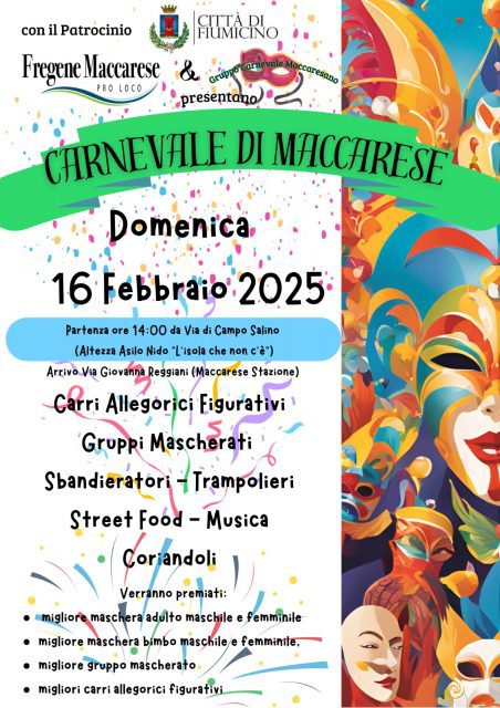 Fiumicino – Domenica 16 febbraio, Maccarese si prepara a vivere una giornata all’insegna della tradizione e dell’allegria con il “Carnevale di Maccarese”, evento patrocinato dal Comune di Fiumicino e organizzato dalla Pro Loco di Fregene Maccarese.