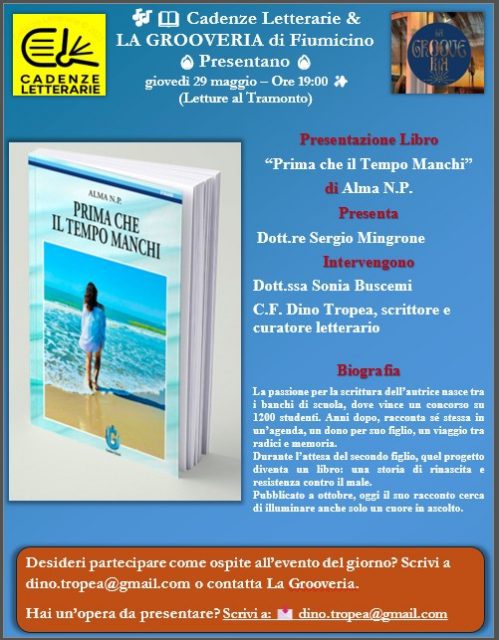 Alla Grooveria di Fiumicino, il 29 maggio 2025 terza tappa di cadenze letterarie con il libro “Prima che il tempo manchi”