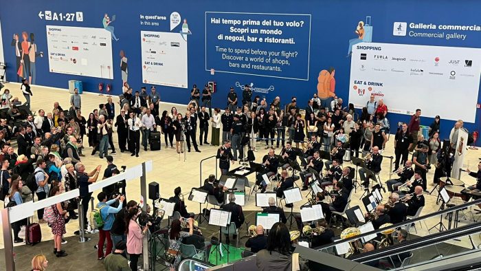 Nella cornice della nuova area di imbarco A per i voli nazionali e Schengen del Leonardo da Vinci, 40 elementi si sono esibiti in brani classici e moderni sotto gli occhi piacevolmente stupiti di passeggeri e operatori.