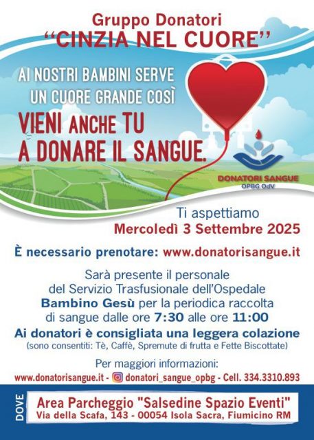 Fiumicino, 3 settembre 2025 – Una mattinata all’insegna della solidarietà quella vissuta oggi a Fiumicino, grazie all’iniziativa per la donazione del sangue organizzata dall’associazione “Il cuore di Cristiano” ed il gruppo donatori “Cinzia nel Cuore”, realtà sempre in prima linea nel sociale e vicina alle necessità del territorio.