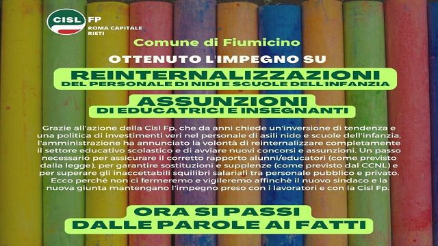 CISL FP : “Bene l’impegno sulle assunzioni e la reinternalizzazione in asili nido e scuole dell’infanzia.”