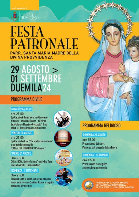 Manca poco all’inizio della tanto attesa Festa Patronale della Parrocchia Divina Provvidenza a Isola Sacra che quest’anno promette di essere ancor più ricca di novità. Una settimana di festeggiamenti uniti ai consueti momenti di riflessione e celebrazione che andranno in scena dal 25 agosto al 1 settembre.